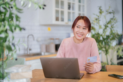 Close-up Cheerful happiness Asian young adult female woman in casual cloth use smartphone online shopping with credit card enjoy purchase discount cloth on sofa in living room at home