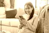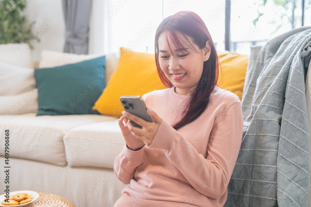 cheerful Asian woman embraces a relaxed and cozy stay-at-home lifestyle as she lies back on a soft sofa, casually dressed and smiling while using her smartphone. The warm daylight highlights the peace