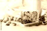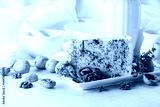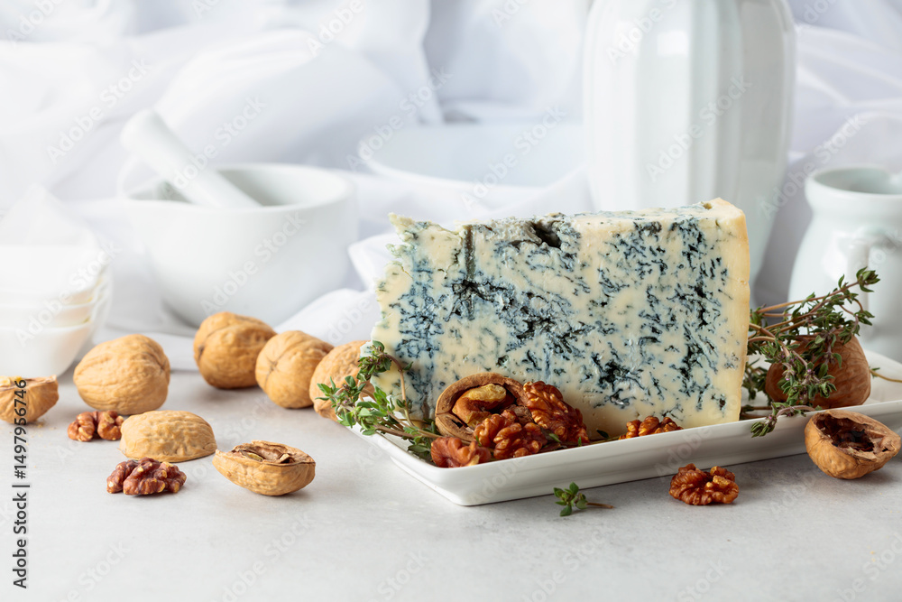 Gorgonzola cheese with walnuts, and thyme on a white table.