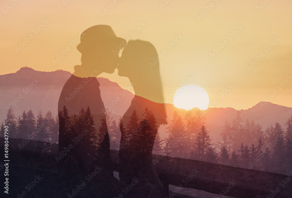 Feeling in love, double exposure of young couple kissing in sunset nature setting