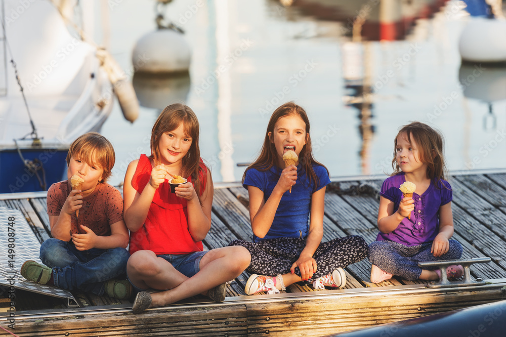 Group of four kids, 3 girls and one boy, eating ice cream outdoors, restion on a pier by the lake