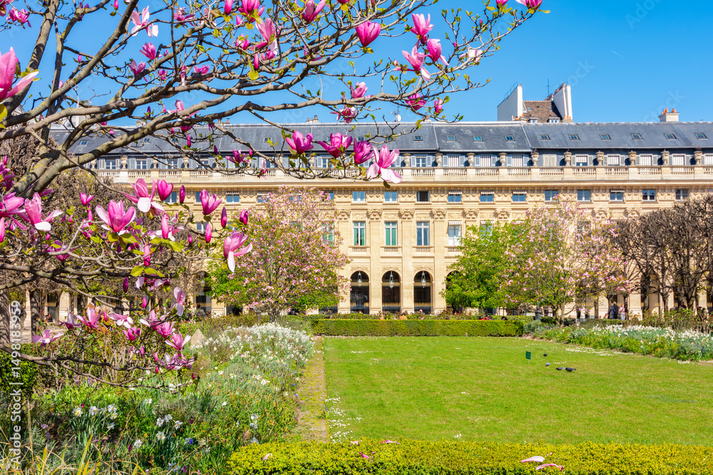 Blooming magnolia in Palais Royal garden in spring, Paris, France