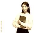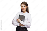 Young professional woman showcases creativity while holding a tablet in a studio setting