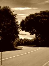 Coastal Road Through the Trees: A scenic coastal road winds its way through lush green trees, offering a glimpse of the serene blue ocean. Capturing the natural beauty of a drive with vibrant trees.
