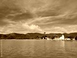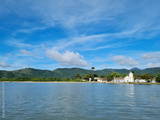 Peaceful Shoreline Vista: A tranquil shoreline meets the clear blue sky, complete with puffy white clouds, where lush green mountains meet the ocean, creating a serene vista.