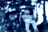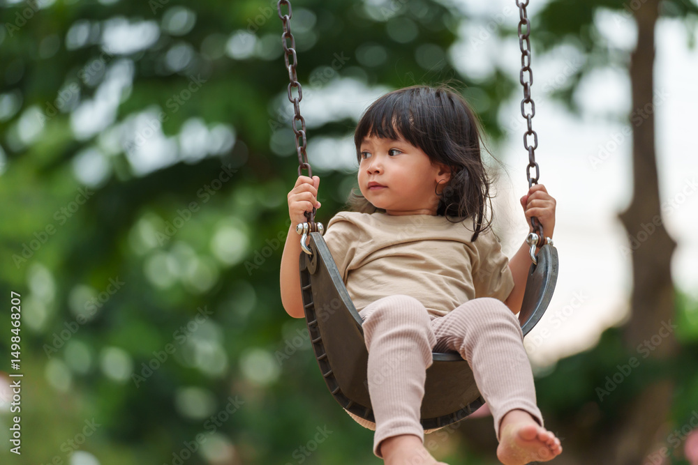 cheerful toddler girl playing on a swing at playground