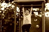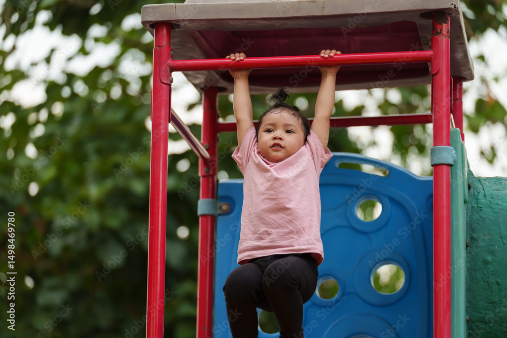 happy toddler girl hanging the red bar by her hand at outdoor playground in park