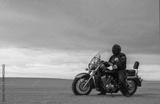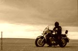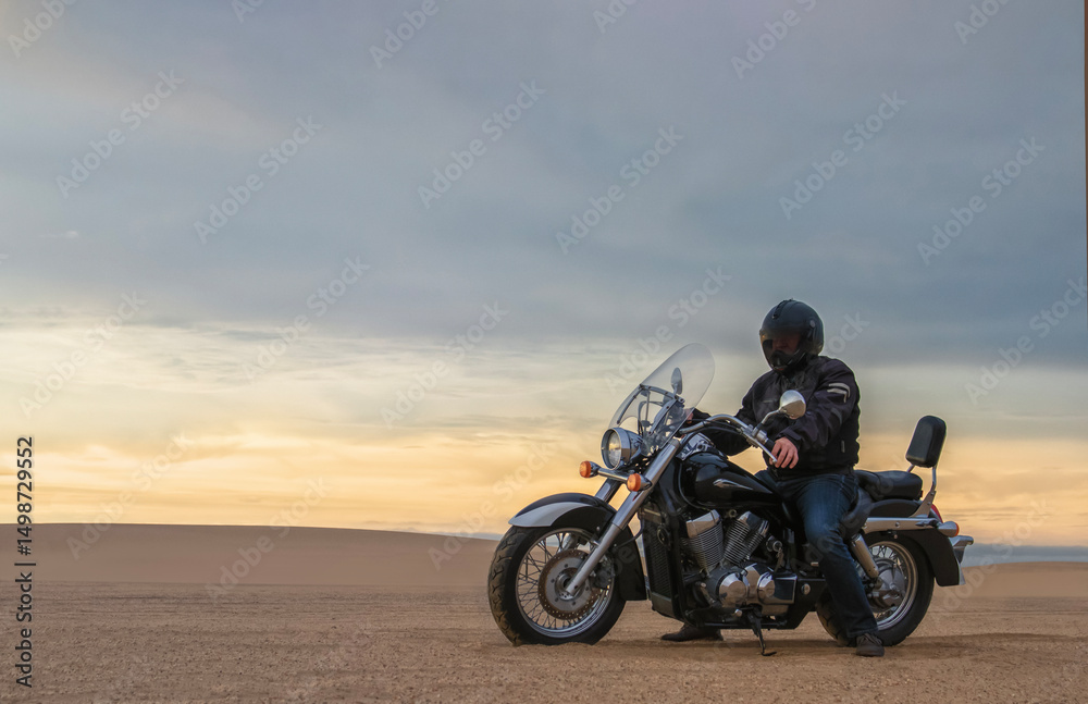 Man on motorcycle in desert during sunset with dramatic clouds — concept of freedom, travel, solitude, adventure, and outdoor lifestyle in wild open landscapes