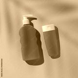 Two square vibrant orange bottles for skincare and sun protection displayed on a yellow surface