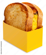 Egg Garlic Cheese Sandwich Toast in paper bucket isolated on white background, Sandwich Toast on white with clipping path, High resolution focus stacking photography.