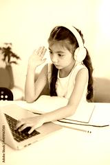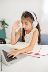 Asian kid girl wearing headphones and raising a hand while sitting in front of a laptop on table.