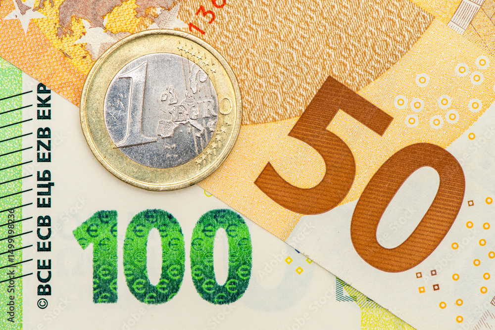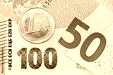 Euro Geldscheine liegen zusammen mit Euromünzen