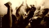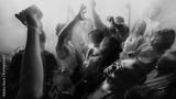 Black and white photo of a lively crowd dancing with hands raised, creating an energetic atmosphere. Concept of party, youth, nightclub, celebration.