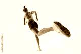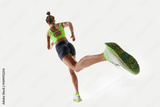 Dynamic back view of female athlete with high raised leg during intense sprint, running on white background. Concept of sport, competition, active lifestyle, strength, effort, energy, momentum.