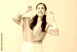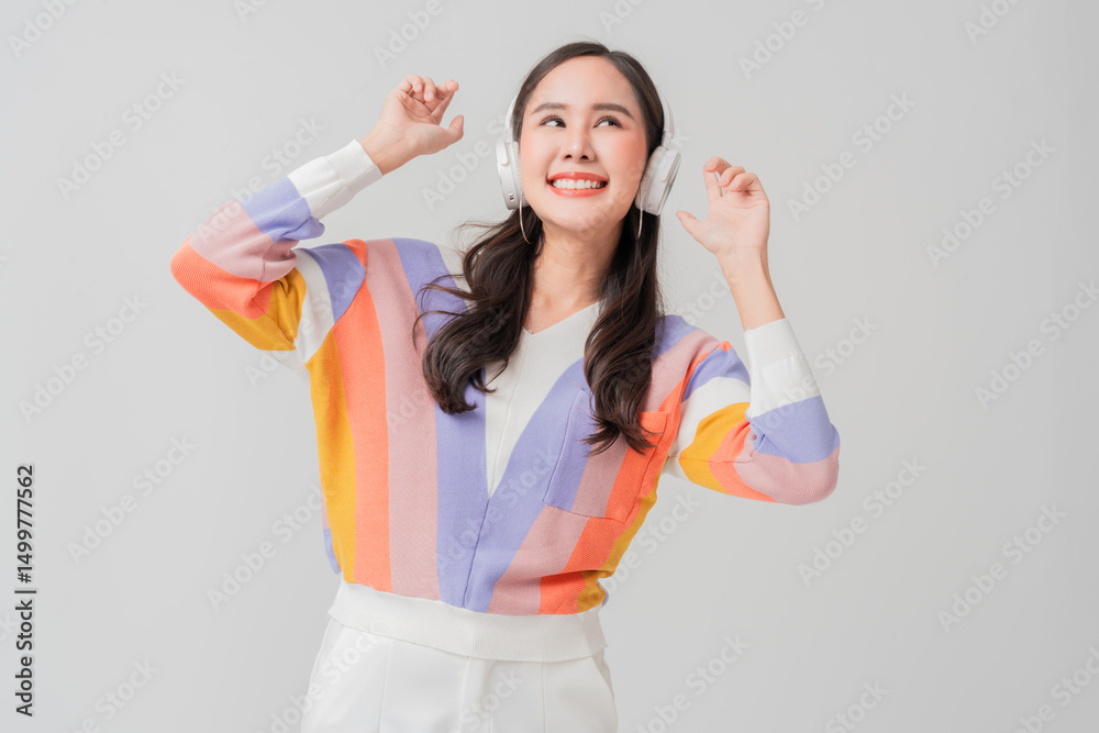 smiling cheerful freshness trendy asian young woman in fashion cloth listening headphone music while dancing hand move gesture happiness enjoy leisure lifestyle moment studio shot portrait