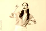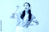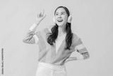 smiling cheerful freshness trendy asian young woman in fashion cloth listening headphone music while dancing hand move gesture happiness enjoy leisure lifestyle moment studio shot portrait