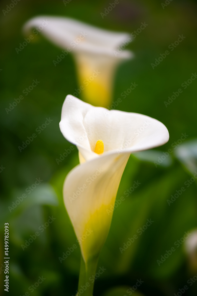 White calla lilies (Zantedeschia) in a city park in Paris, France. Close-up of 2 white magnificent flowers with white spathe and orange spadix. Blurred background with green leaves. Symbol of love.