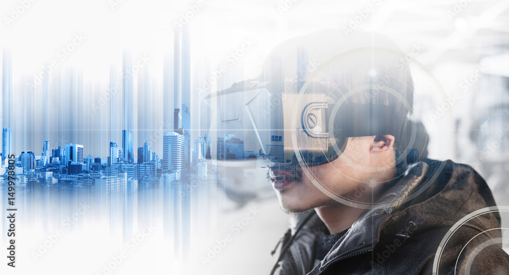 Businessman wearing virtual reality googles, futuristic realistic technology innovation concept