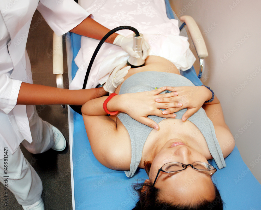 Asian woman undergoes an abdominal ultrasound performed by a nurse, focusing on internal examination for diagnostic purposes