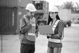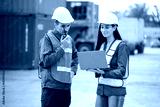 Engineers or workers using laptop computer and talking about work in containers warehouse storage