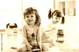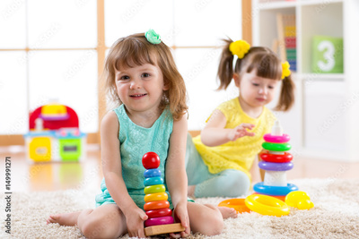 Children playing together. Educational toys for preschool and kindergarten kids. Little girls build pyramid toys at home or daycare.