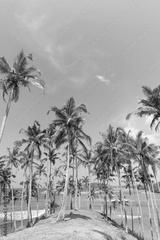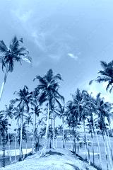 Palm trees on tropical island coast with blue sky and clean calm water