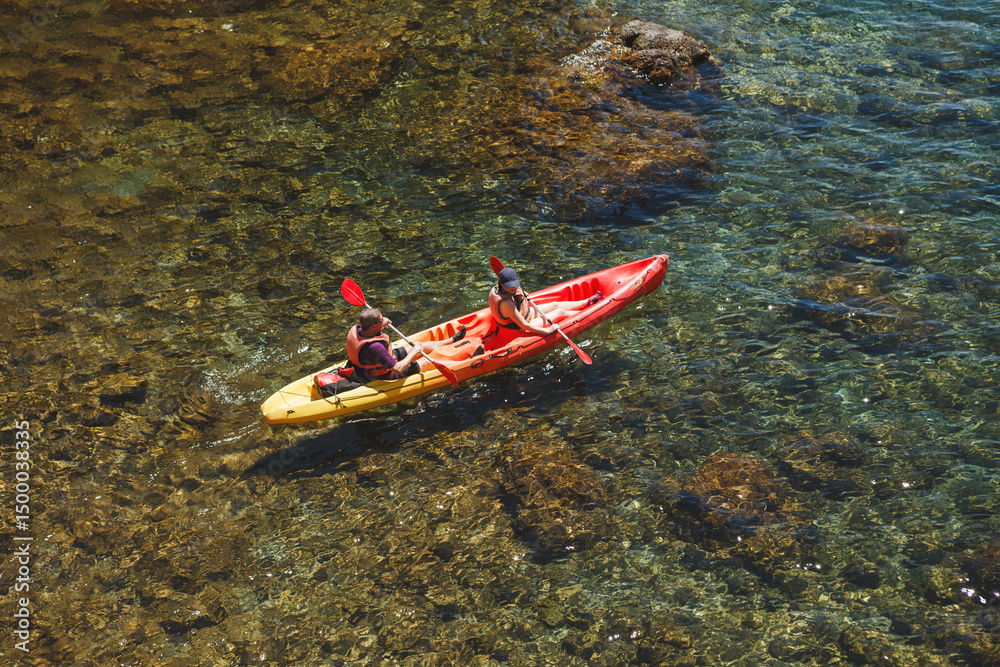 Dubrovnik, 28.06.2019, Croatia: Two people floating in a canoe. View from above