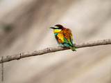 Photograph of european bee-eater (Merops apiaster) bird sitting on the branch and ruffling feathers