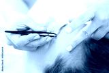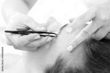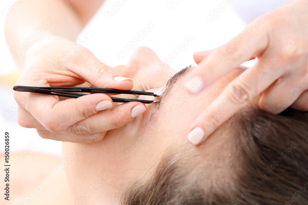 Regulacja brwi pęseta. Kosmetyczka depiluje brwi klientki nadając im odpowiedni kształt