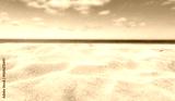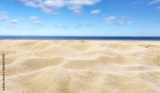 Beach Sand Close-Up with Copy Space – Summer Background for Product Placement. Sunlit beach sand with soft focus blue sea and sky in the background