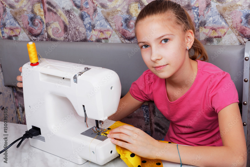 Girl learns to sew on an sewing machine