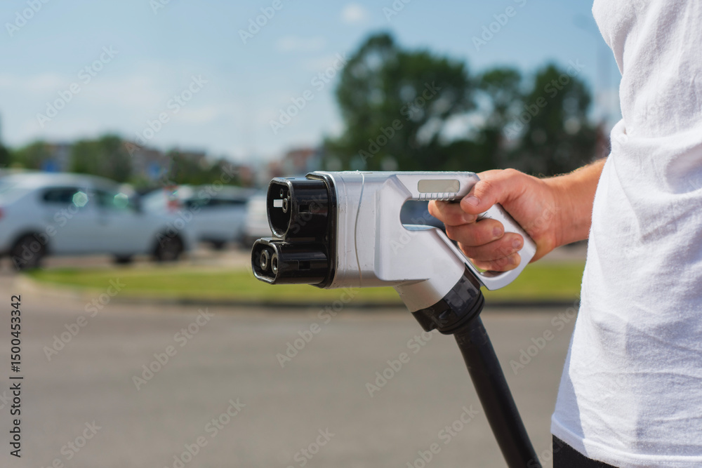 A man holds an electric car charging plug near a parking lot. Concept clean energy, modern transportation, and eco-friendly infrastructure.