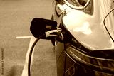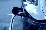 Electric car is connected to a charging station in a parking lot. Concept of an electric vehicle and energy source dedicated to the theme of sustainable mobility and clean energy.