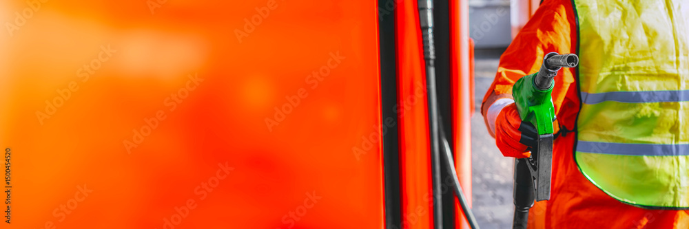 Gas station worker in signal clothing holding a gasoline gun at a fueling station. Fueling station concept on the theme of transportation and energy resources.