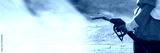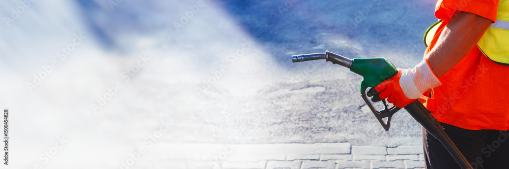 Gas station worker in signal clothing holding a gasoline gun at a fueling station. Fueling station concept on the theme of transportation and energy resources.
