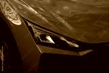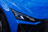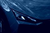 Front of a blue sport car with modern headlights parked on an asphalt surface. Concept for automotive and commercial projects.