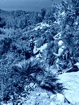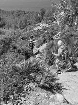 Women hikers on a steep footpath on a slope down a forest on Mallorca