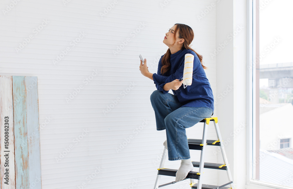 Asian young beautiful woman long curly hair wearing blue shirt jeans sit on on ladder look at smartphone, learning to repair paint wall empty house or apartment renovation and decoration room concept.