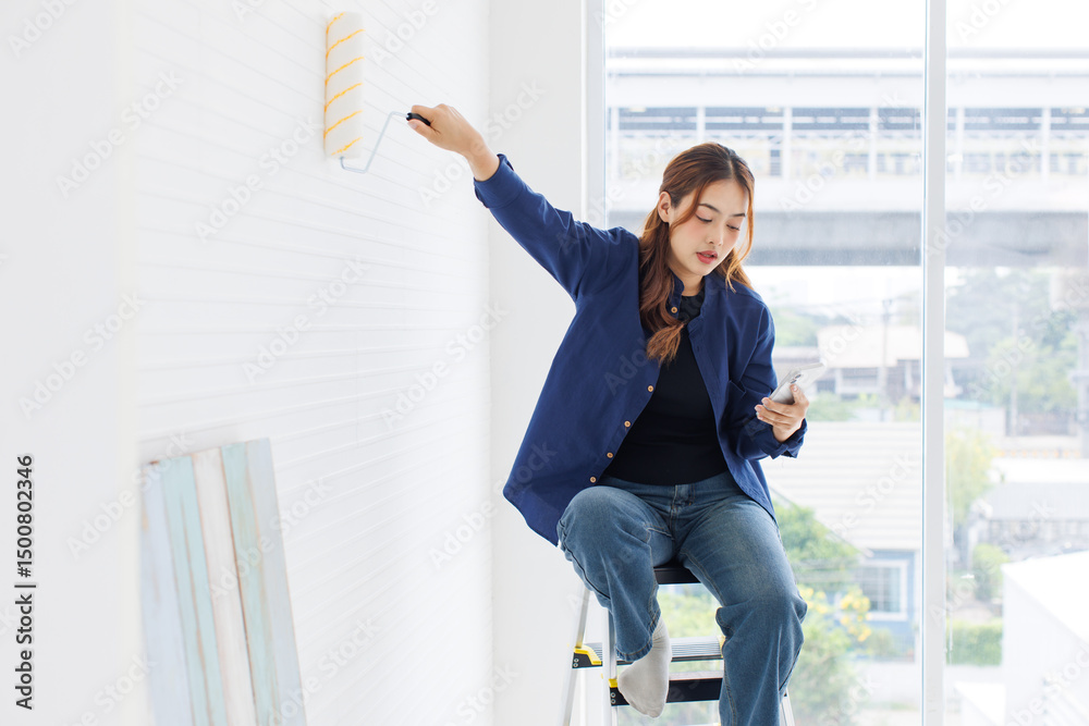 Asian young beautiful woman long curly hair wearing blue shirt jeans sit on on ladder look at smartphone, learning to repair paint wall empty house or apartment renovation and decoration room concept.