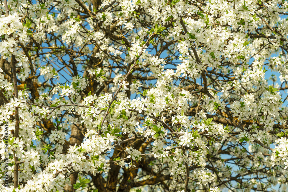 White spring flowers on a blooming tree branch with small blossoms and vibrant blue sky. Nature background for seasonal design.