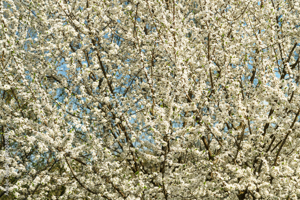 White spring flowers on a blooming tree branch with small blossoms and vibrant blue sky. Nature background for seasonal design.