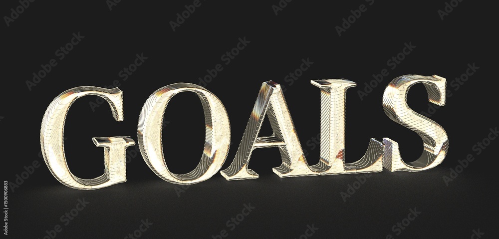 3D rendered gold 'Goals' text on black background. Perfect for business, success, and ambition concepts.