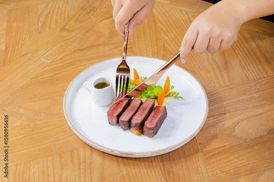 Medium Rare Wagyu Beef Steak with Sauce and Vegetables on White Plate