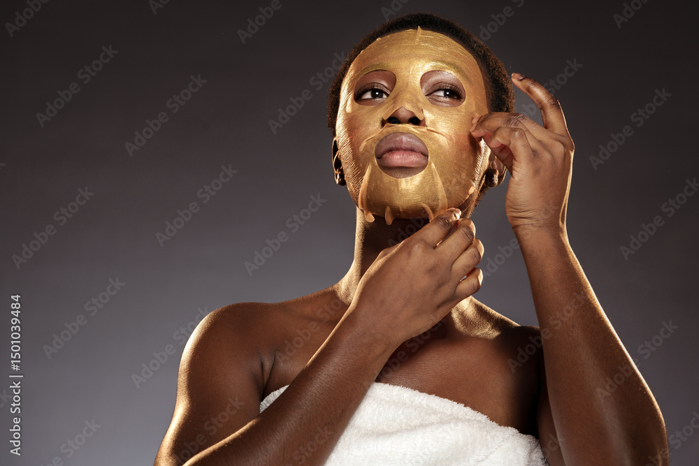 Woman applying gold facial mask in a spa setting for skin rejuvenation and relaxation