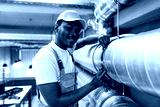 Skilled worker performs maintenance on industrial piping in a modern facility during daytime