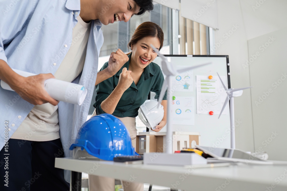 Collaboration and Innovation. Young engineers discussing renewable energy projects in office.