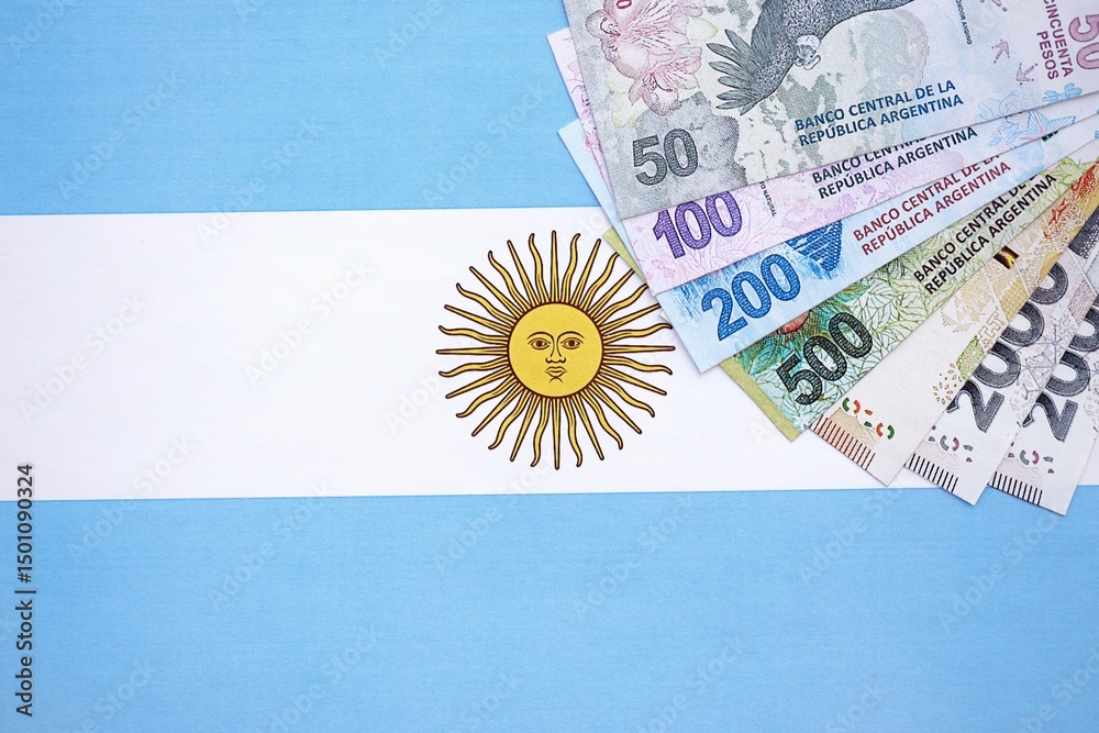 Argentine pesos money bills in big amount lies on Argentina flag close up