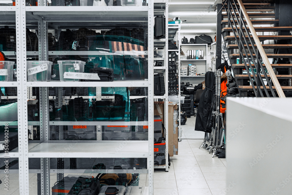 Storage area filled with equipment and tools in a well-organized workshop during daylight hours