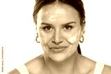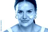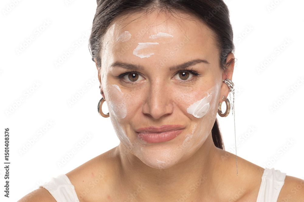 Studio shot on white background of woman with cream on face posing for skincare product concept