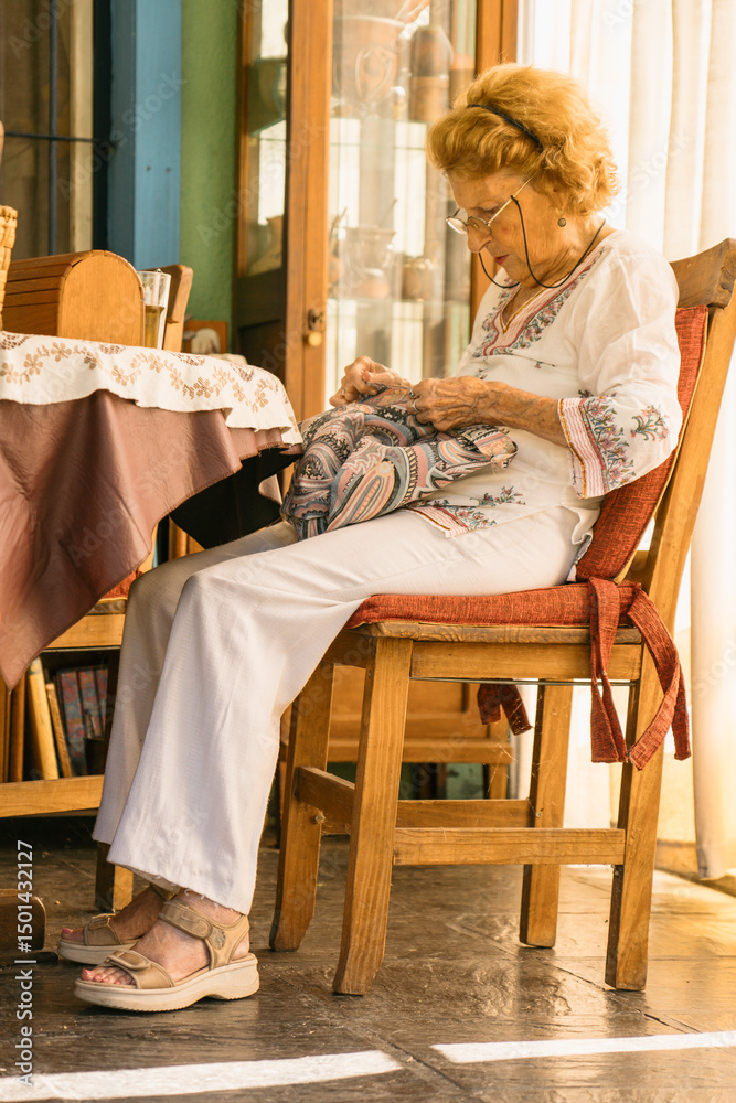 Elderly woman sewing a colorful fabric while sitting on a wooden chair